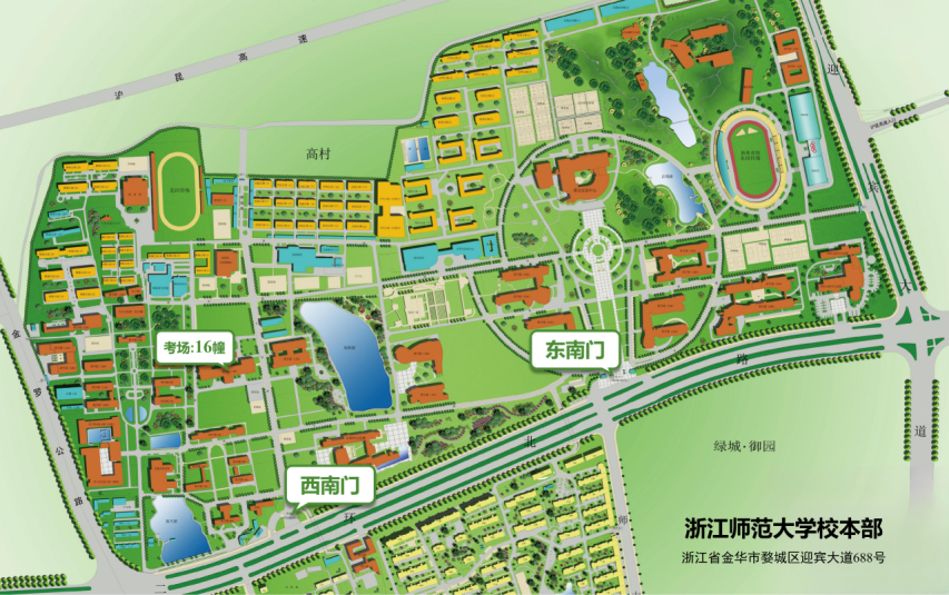 浙师大毗邻G60沪昆高速,请在“金华”出口下高速,行驶2公里左右即可到达浙师大西南门。